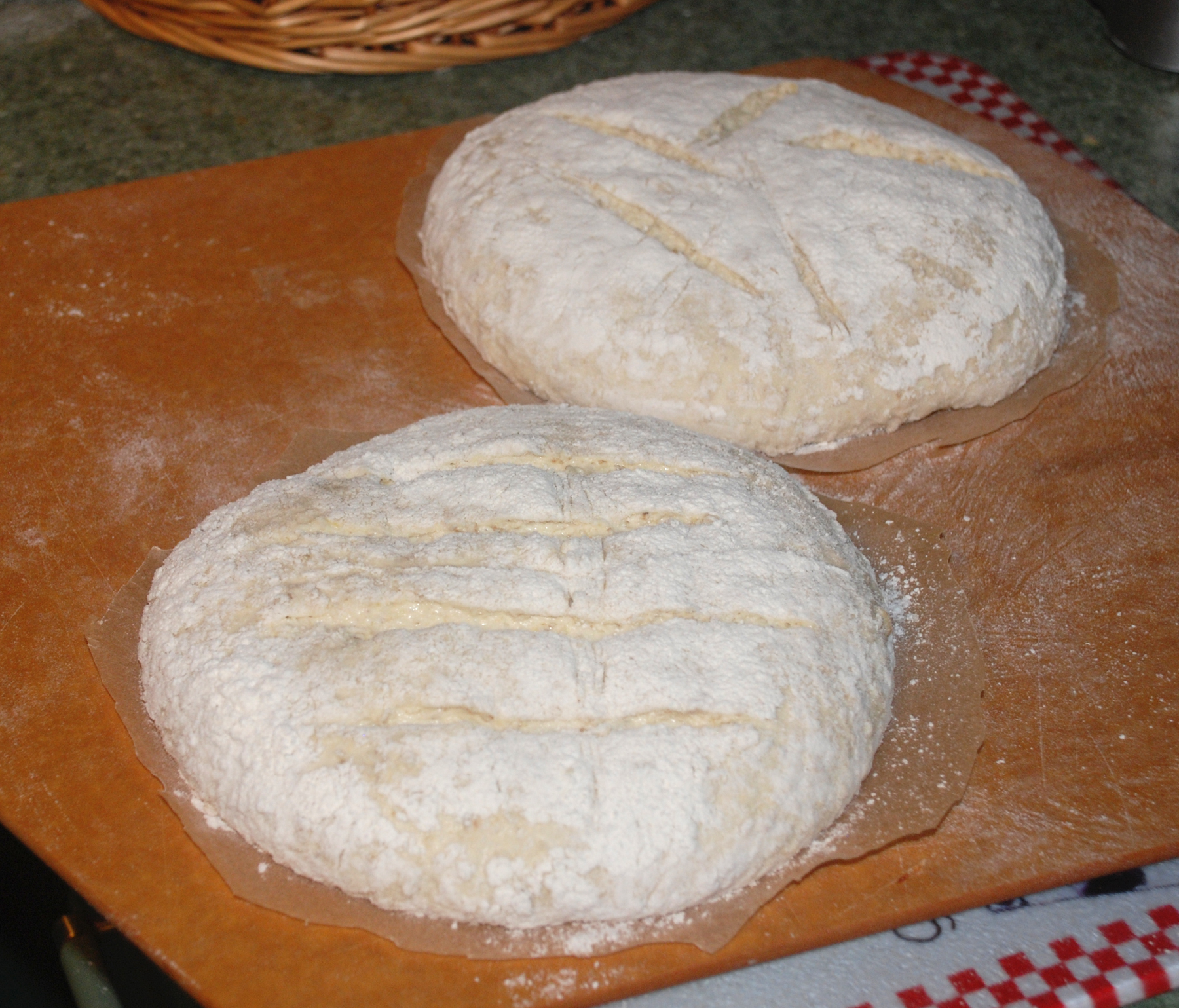 Slash loaves as desired and place empty pan in bottom shelf of oven.