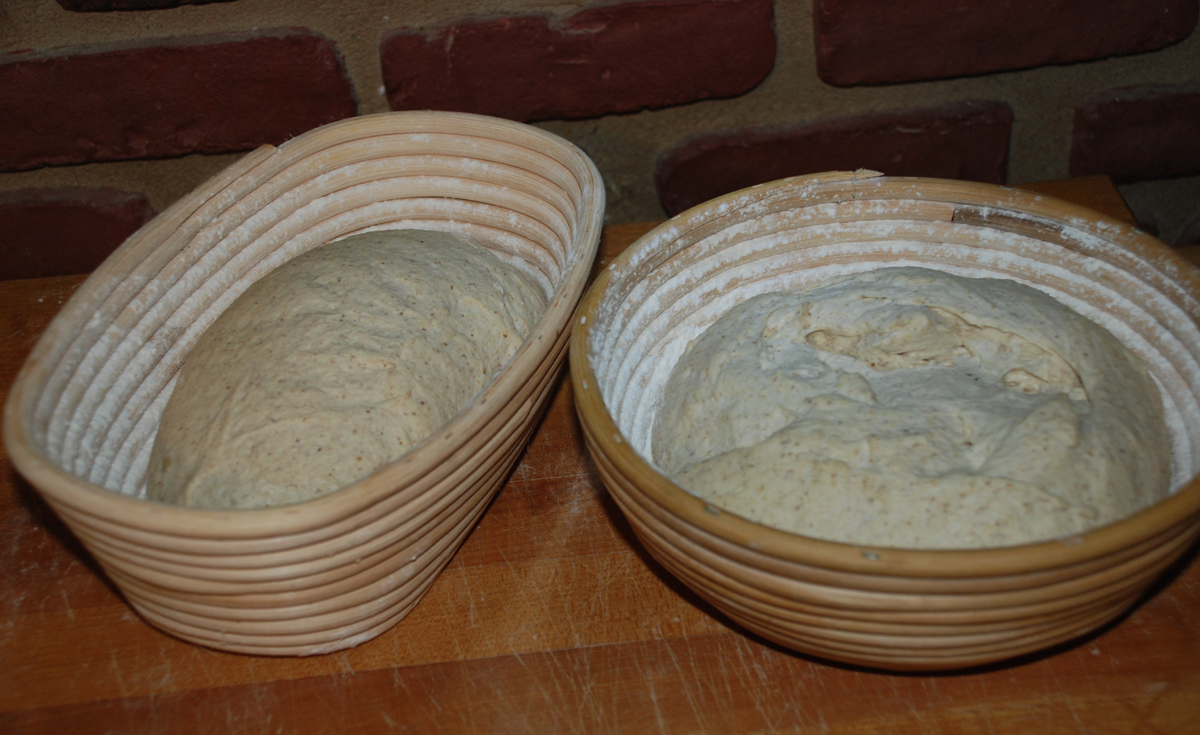 Slash loaves as desired and place empty pan in bottom shelf of oven.