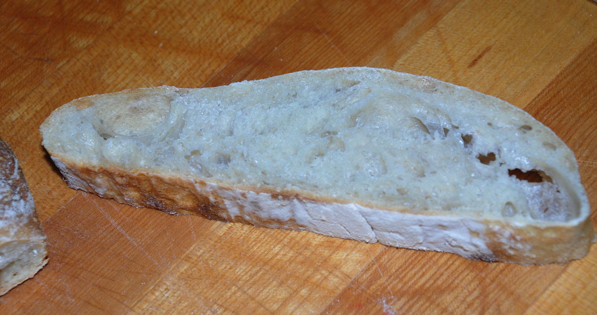 The bread should have nice large irregular holes and should be soft after cooling. You should notice a nice slightly tangy sourdough flavor with a great chewy crust.