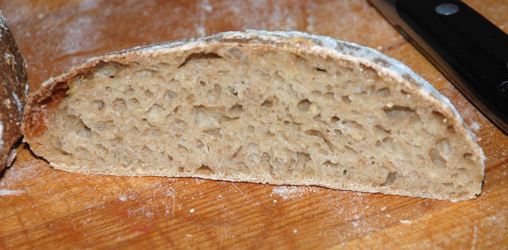 The final bread came out pretty good with a nice open and moist crumb and a good tangy flavor. The only issue I have is that I left the final dough to rise too long and it ended up getting deflated slightly which caused the end result to be a little flatter than it should have been. If you make this recipe and use bannetons to form your final loaves, be sure to use plenty of flour to prevent it from sticking.