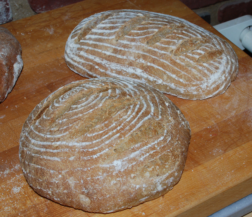 Slash loaves as desired and place empty pan in bottom shelf of oven.