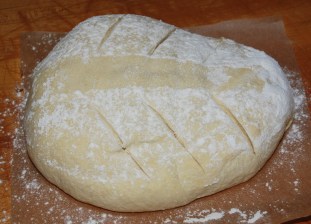 If you want to make the fancy “Corn Stalk” design, cut a strip of paper and place it on the middle of the round dough and sift a light dusting of flour over the dough.  Next make 3 slashes on both sides of the “stalk” and then  place an empty pan in bottom shelf of your oven.