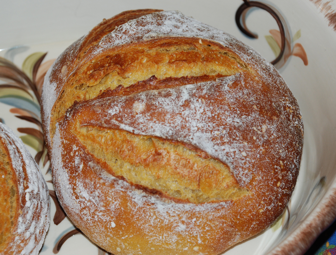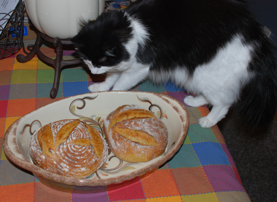 Slash loaves as desired and place empty pan in bottom shelf of oven.