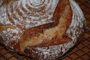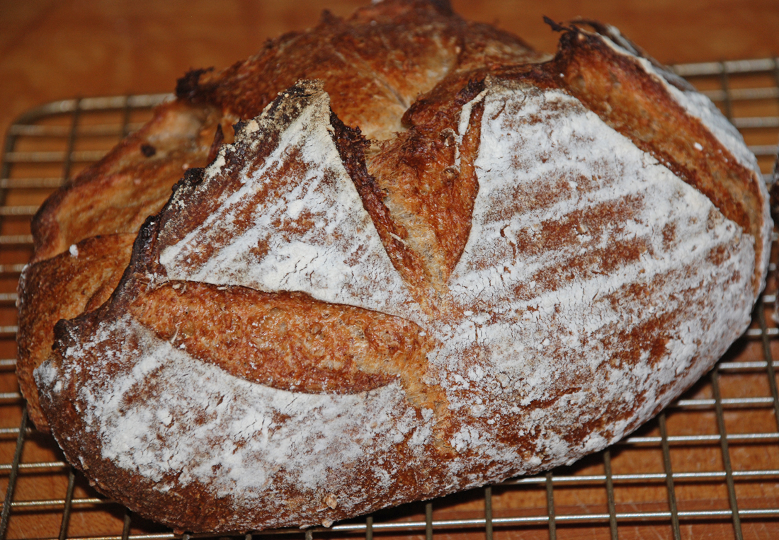 I really did intend to make one of the 100 recipes I have saved from assorted websites and blogs or one of the 1000 recipes from one of my bread books…..really…I did. Well this recipe is kind of adapted from Peter Reinhart’s The Bread Bakers Apprentice. I started with the recipe for Italian Bread and changed the biga to using my sourdough starter or levain and used European style flour, rye, barley and whole wheat flour instead of bread flour. I also added some organic cracked wheat bran to make it interesting and used molasses instead of sugar. Oh…and I used buttermilk instead of water…but other than that it’s like I copied the recipe from the book!