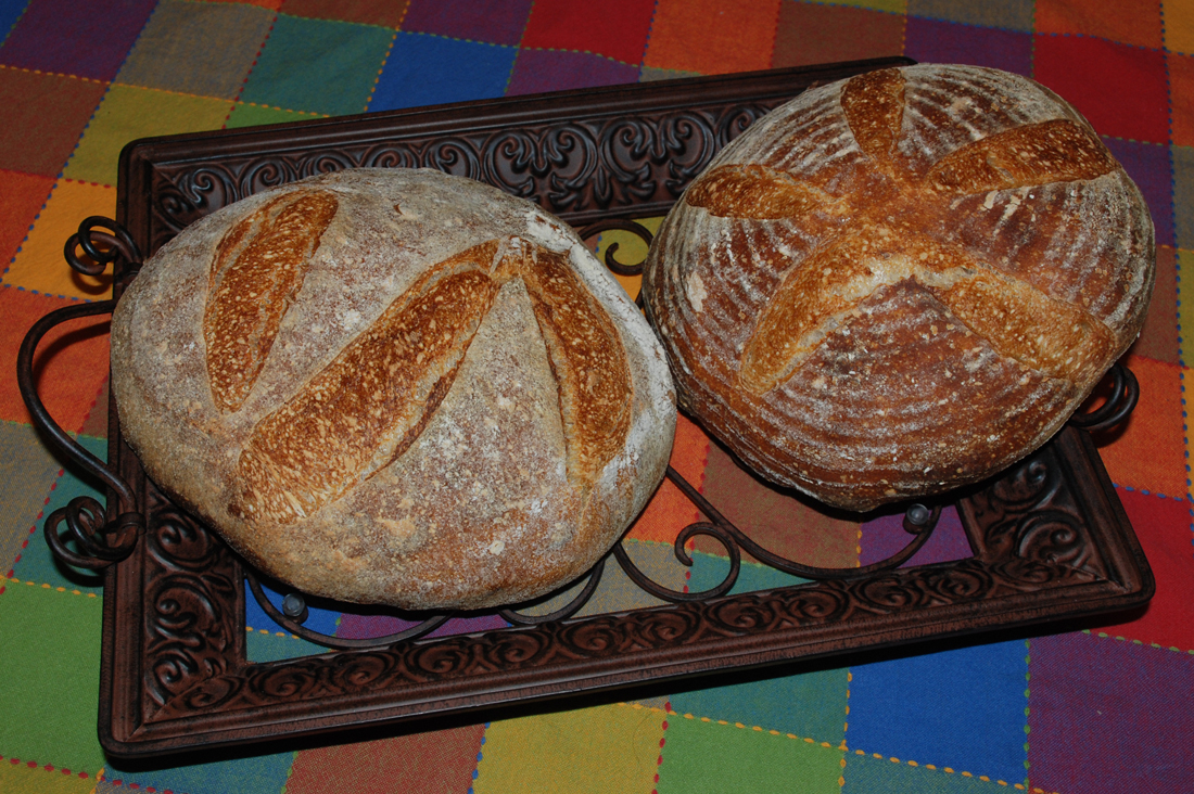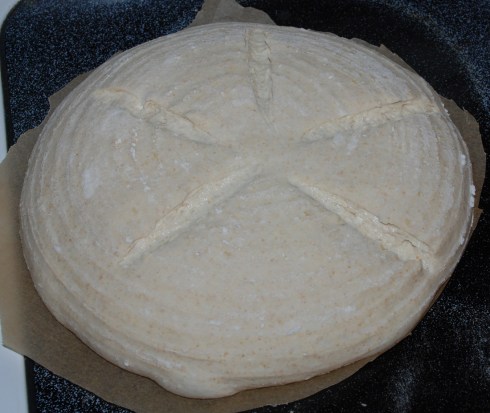 The dough was nice an elastic and puffed up very nicely. Unfortunately I didn’t realize that the risen loaves would be too big to fit in my oven at the same time. I had to adjust the loaves while the oven was nice and hot and subsequently one of the loaves was hanging off the baking stone for a few minutes causing it to sag slightly.