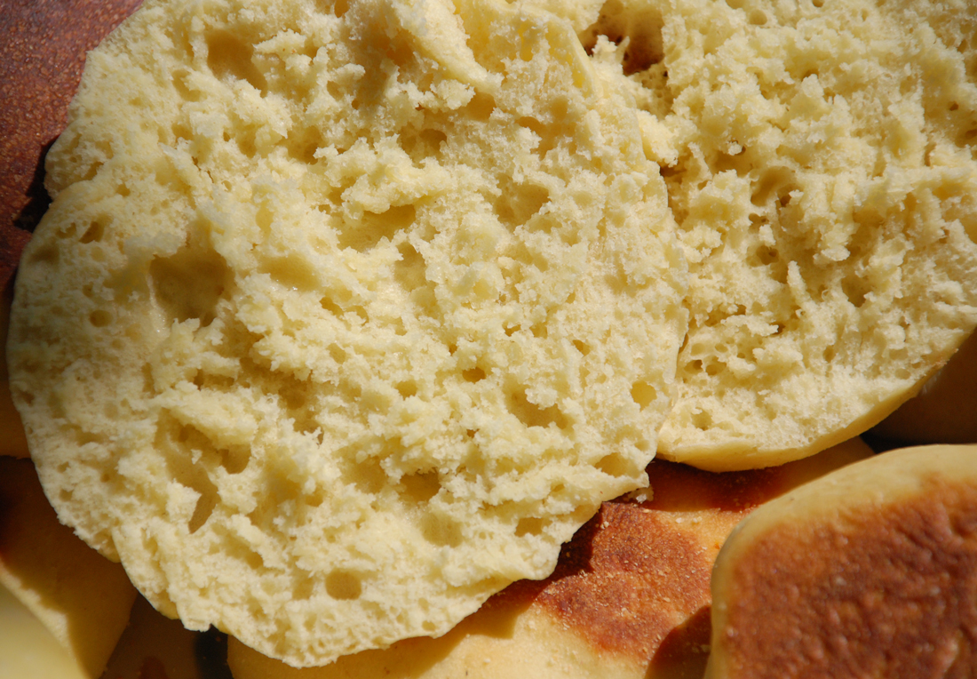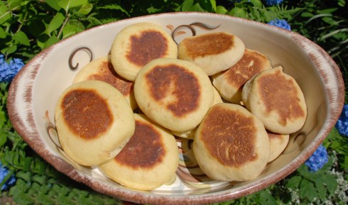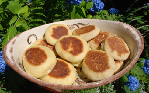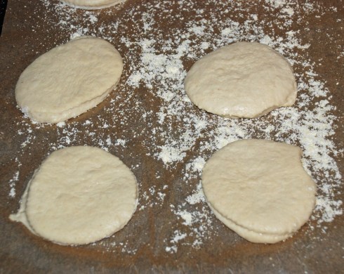 The next morning add the rest of the ingredients and mix for a minute. Knead the dough either with your mixer or by hand for around 4 minutes, adding additional flour if necessary. Next roll out the dough to about 3/4″ thickness on your work surface. You will have to put some bench flour on the work surface to prevent the dough from sticking. Using 4″ biscuit cutter or can, cut the muffins out and place on a pan lined with parchment paper dusted with corn meal or semolina flour. You should end up with 5-6 muffins. If necessary you can combine the scraps and roll out again but you may need to let it rest before rolling.