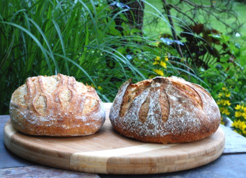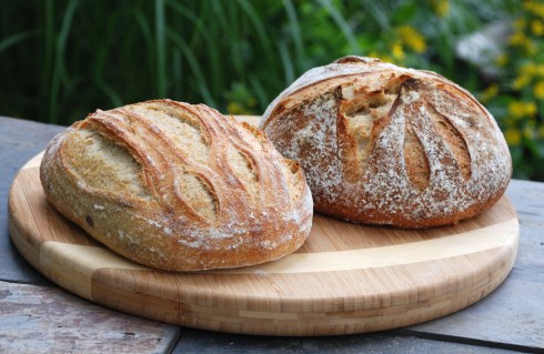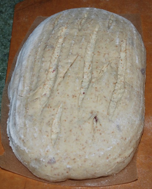 The next day (or when ready to bake) let the dough sit out at room temperature for 2 hours.  After 2 hours form the dough into your desired shape and put them in floured bannetons, bowls or on a baking sheet and let them rise covered for 2 hours.  Score the loaves as desired and prepare your oven for baking with steam.