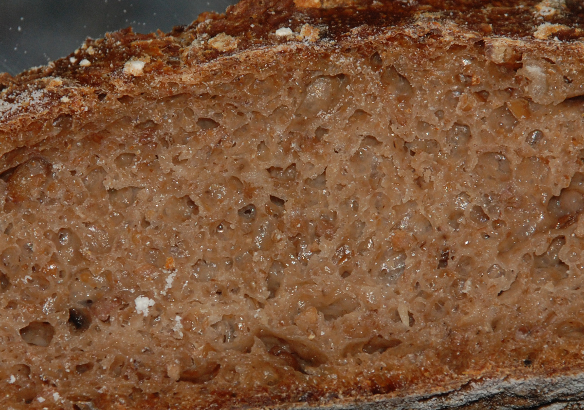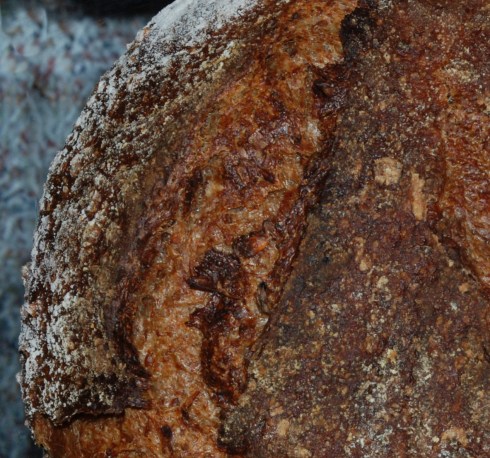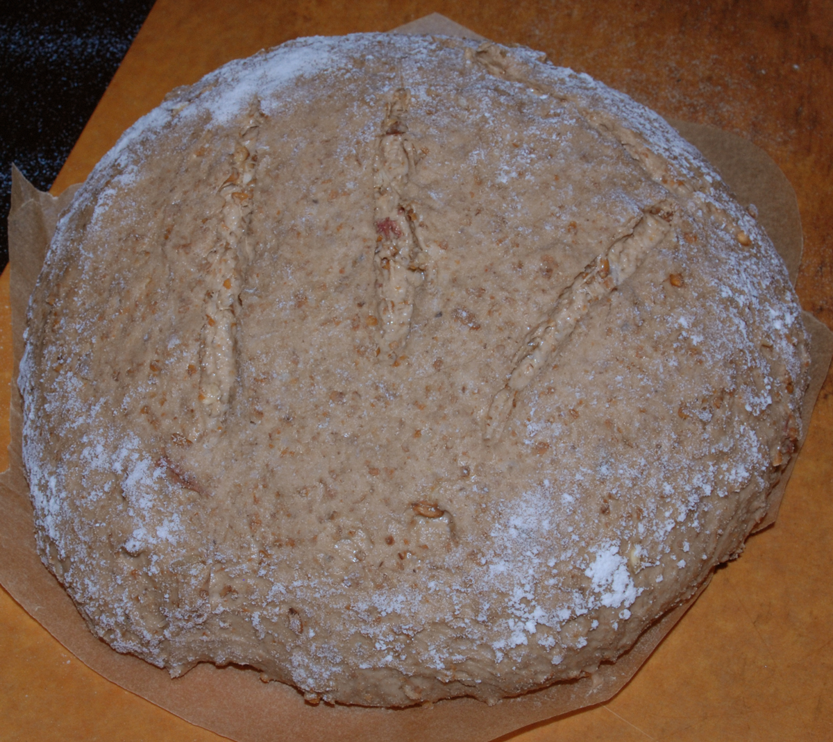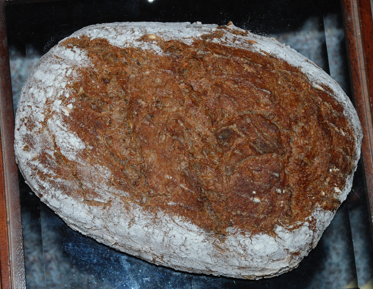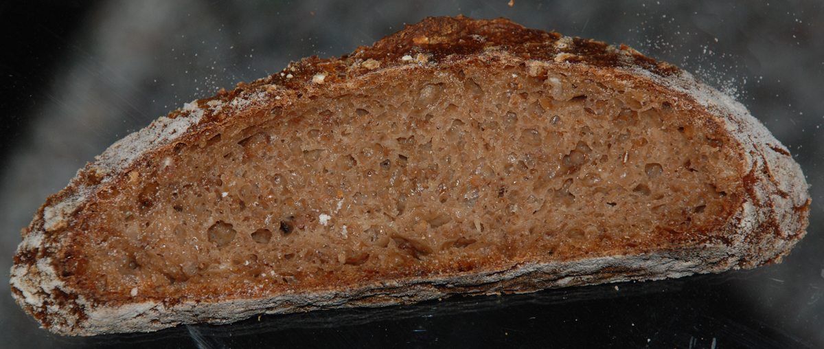 I used some rolled oats, cracked wheat and malted rye berries for the soaker and for the final dough I used durum, dark rye, white rye, European style flours and some roasted wheat germ. I added some barbecued potatoes and pistachio oil as well.