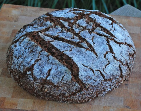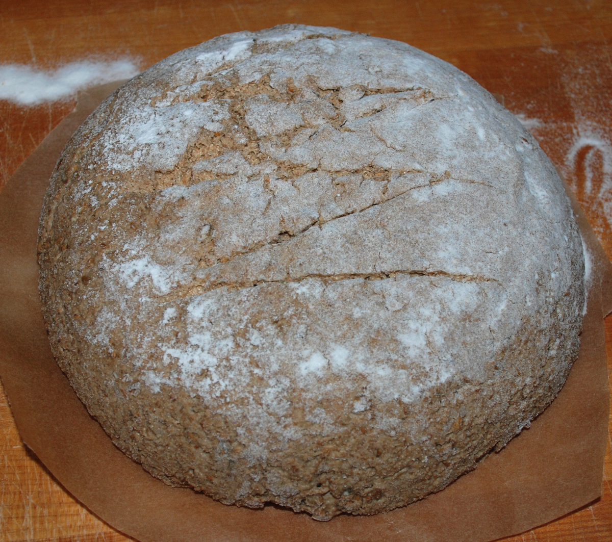 The next day I let the dough sit out at room temperature for 2 hours. I had planned to make 2 boules but since this dough was so moist and did not come together like a bread made with white flour I decided to form it into a large Miche. Alternatively I could have formed it into loaves and baked in a bread or Pullman pan.