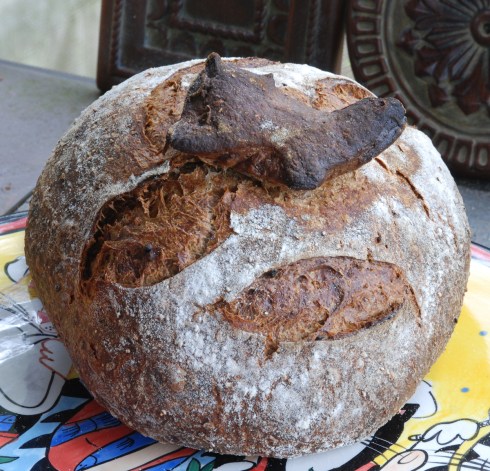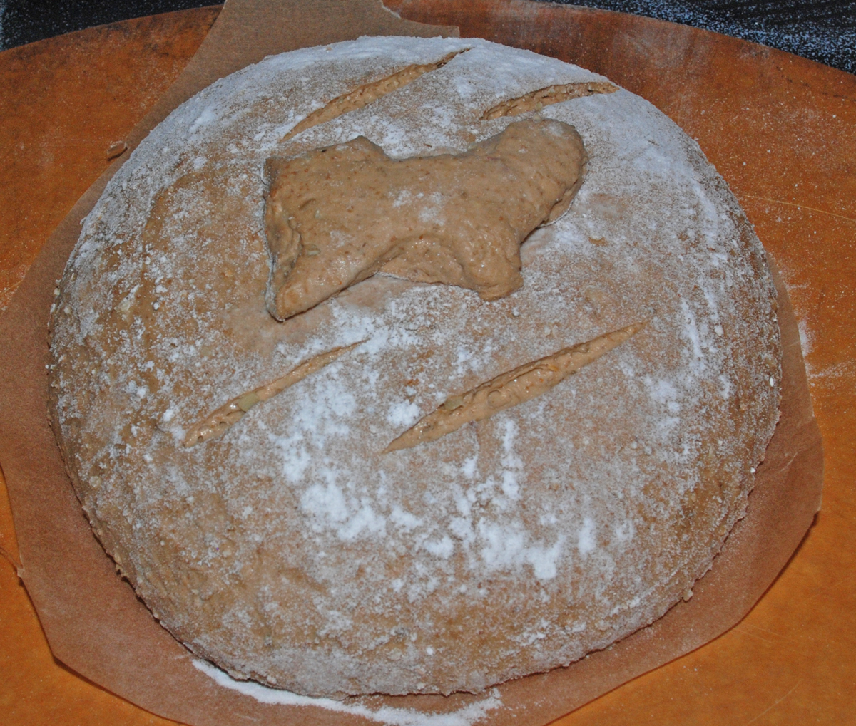 I let this rise covered with a towel and when ready to bake the loaves I glued it on the loaf with some water.  In hindsight I should have adhered the dough better as it kind of puffed up and looks like a handle.  Hey, I guess that could be a new concept….a built-in carry handle for your loaf of bread!