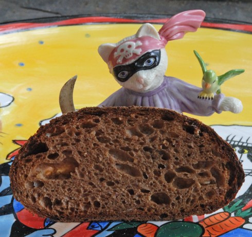 I am happy to report that the bread is nice and moist and you taste the espresso powder and a hint of the hot chocolate.  The rye chops and First Clear flour along with the Oat flour and White Rye give this bread a nice earthy flavor that Mookie liked so much he refused to share it with his brother and 3 sisters.