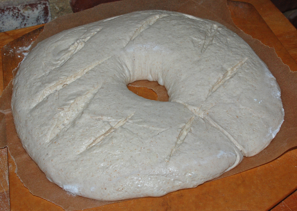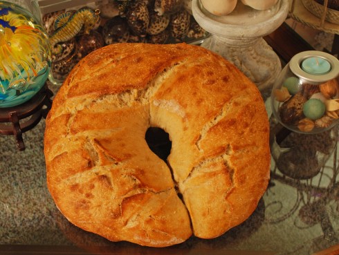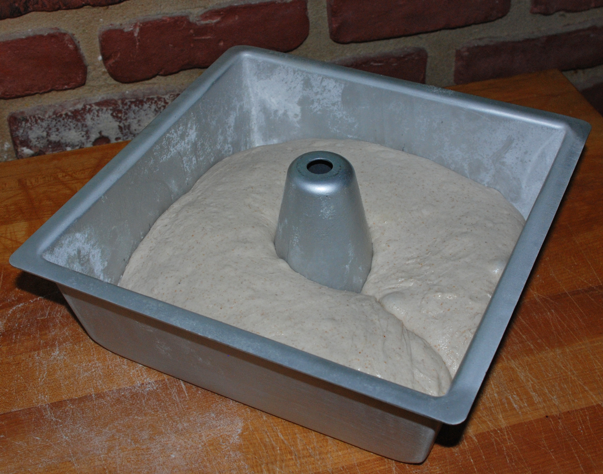 I have been waiting for the right bread to use my new square-shaped cake pan with a middle column.  Unfortunately this didn’t really work the way I hoped and instead of a square loaf with a hole in the middle I ended up with a horseshoe-shaped loaf and a pretty big one at that!