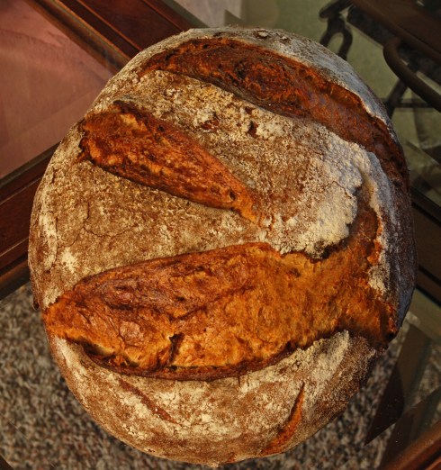 Set your oven for 500 degrees F. at least 45 minutes before ready to bake. When ready to bake place the loaves into your on your oven stone with steam and lower the temperature immediately to 450 degrees. When both loaves are golden brown and reached an internal temperature of 200 degrees F. you can remove them from the oven. Since this was one large loaf it took about 55 minutes to bake. (Note: since I made one large Miche I had to lower the temperature to around 425 degrees F. with about 20 minutes to go so the crust would not get too dark).