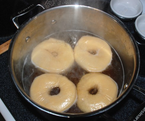 The next morning heat your oven to 460 degrees F. while at the same time prepare a large pot of water and bring to a rolling boil.  Add another 25 grams of malt syrup to the boiling water (note this is not listed in the total ingredients).  Next add 2-3 bagels at a time in the boiling water and remove them once they start to float.