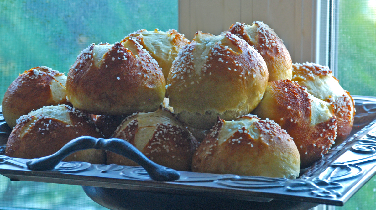 Another note, don’t do what I did the first time and use parchment paper to line your cookie sheets. I did this foolish thing and had to cut the paper off the bottom of most of the pretzel rolls. Instead, use metal baking sheets and spray them heavily with cooking spray. If they still stick you can simply use your dough scraper to loosen them from the baking sheet.
