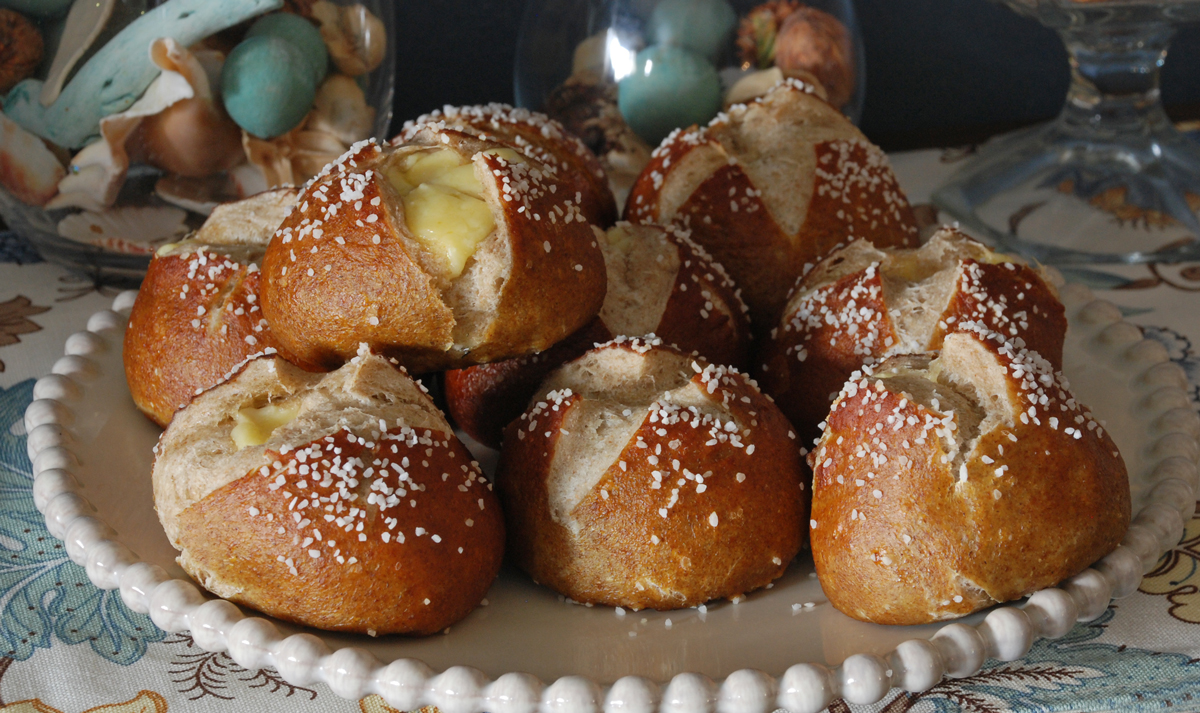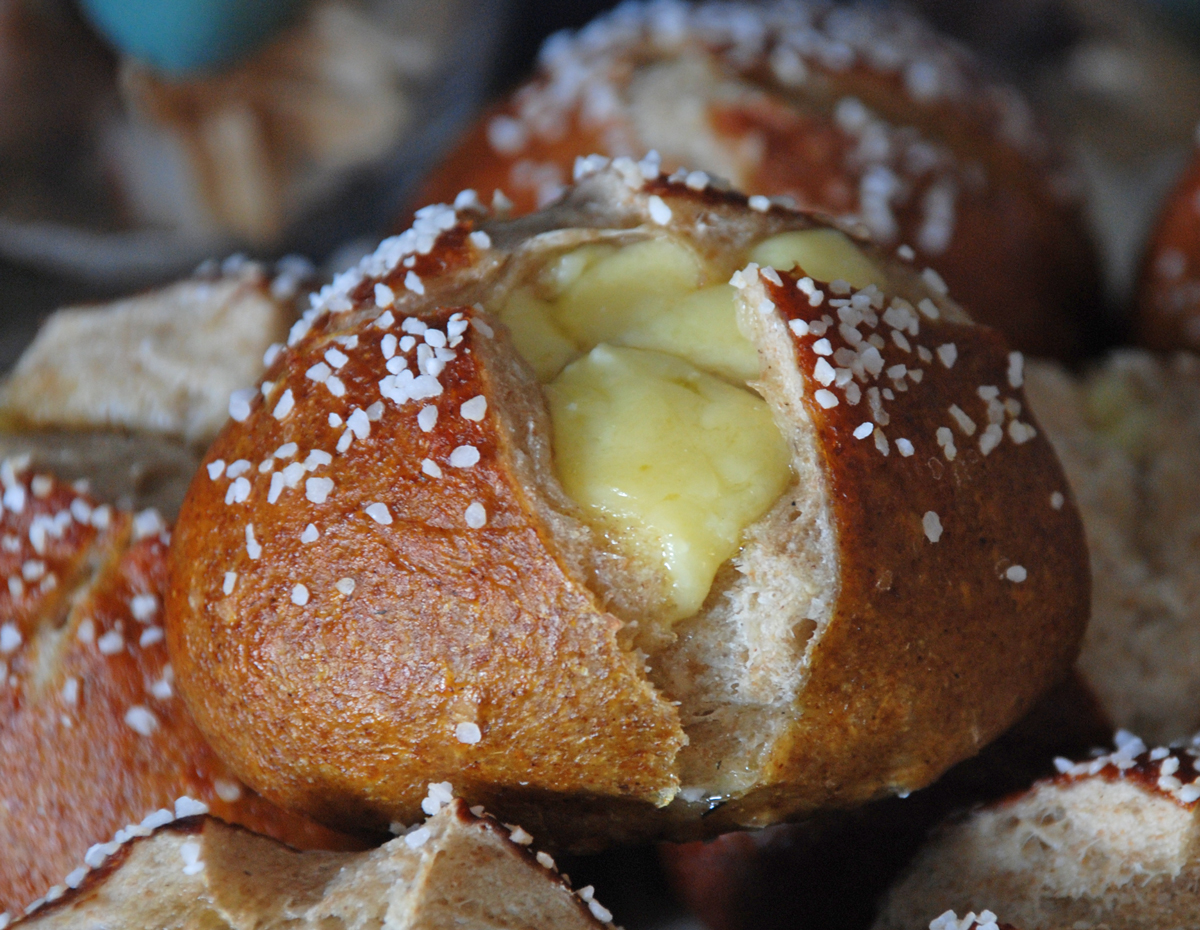 Pumpernickel Cheddar Cheese Sourdough Pretzel Rolls