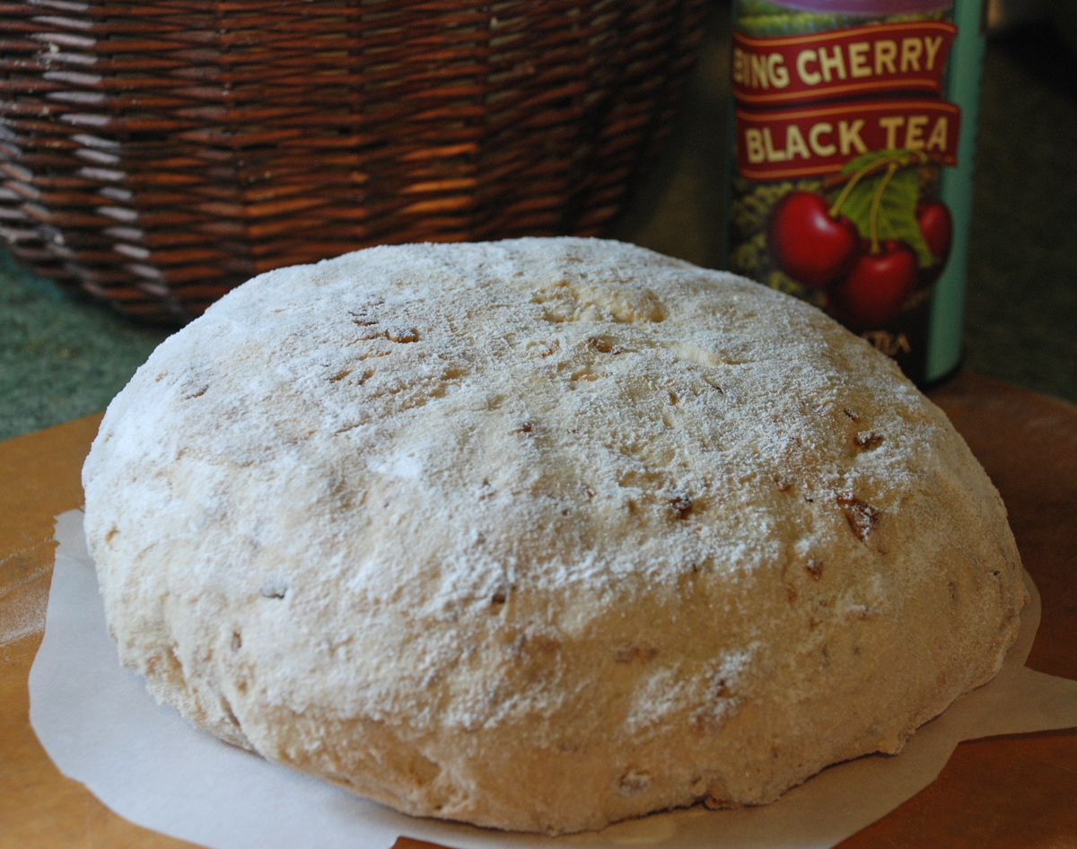 Using the 36 hour technique I adapted from TxFarmer’s blog posts on The Fresh Loaf, I made a hearty style loaf with my favorite cherry flavored tea, fresh chopped cherries and some oat flour. I used the oat flour in the levain as well as the final dough. Some potato flour and malted wheat flakes were added to round out this dough.