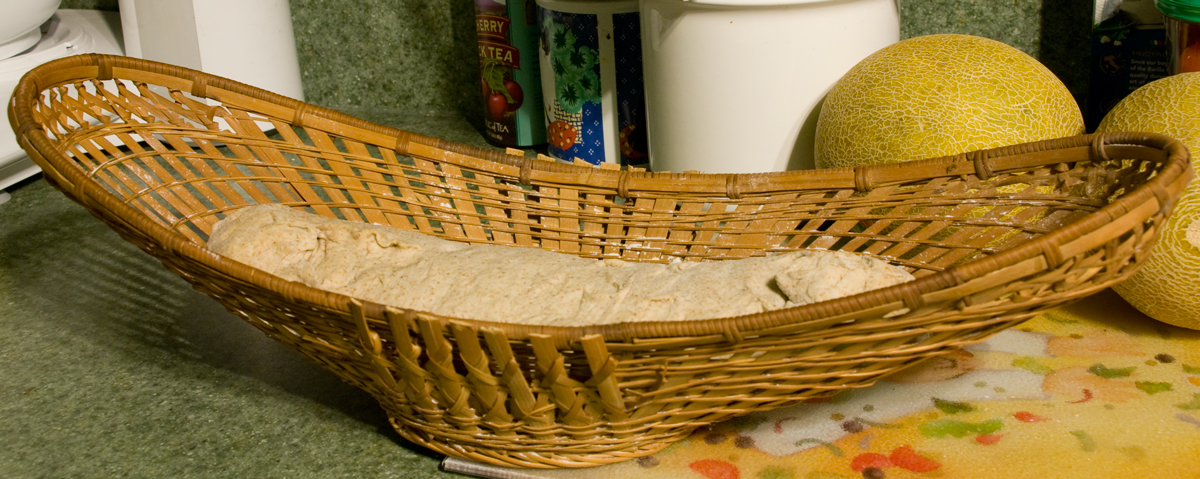 When you are ready to bake remove the bowl from the refrigerator and let it set out at room temperature still covered for 1.5 to 2 hours.  Remove the dough and shape as desired.  I made 1 large batard shape but you can make boules or other shapes.  Place your dough into your proofing basket(s) and cover with a moist tea towel or plastic wrap sprayed with cooking spray.  The dough will take 1.5 to 2 hours depending on your room temperature.  Let the dough dictate when it is read to bake not the clock.InBasket