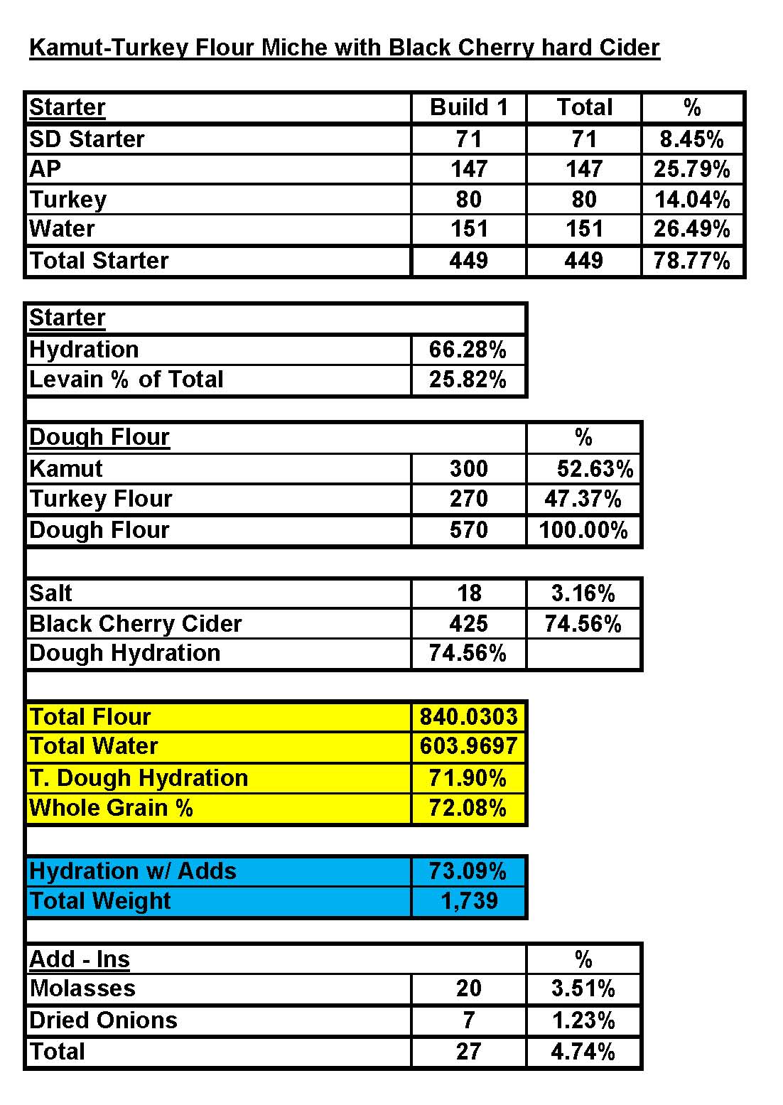 I followed my normal procedure below for making a miche and I must say I was very happy with the results. You can taste the nuttiness of the 2 flours along with the hint of cherry from the cider. The crust was nice and thick but the crumb was a bit tight which was probably due to the high percentage of the Turkey flour along with the Kamut flour.