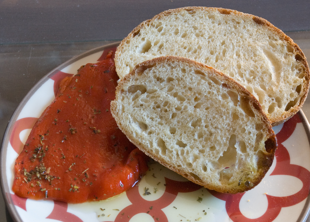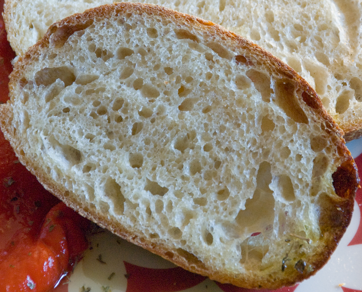 I have to say that this dough came together as a nice silky moist and tacky dough and was easy to work with.  The final bread had a wonderful yellow crumb which was nice and open.  The crust was just chewy enough as to be ideal and made this a joy to eat dipped in some olive oil with a little roasted red pepper.
