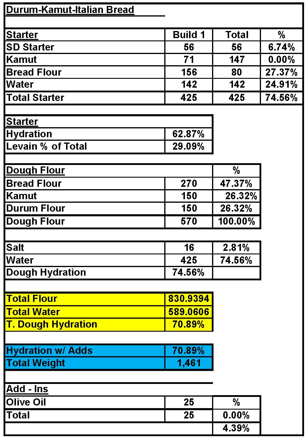 I recently made bread with Kamut which has a similar color and nutty flavor like Durum wheat and I wanted to combine the two together along with some organic Bread Flour I just received from KAF to add enough gluten to pull it all together.  Kamut wheat does not have a strong gluten structure so it’s important to combine it with a flour that has a higher protein level.