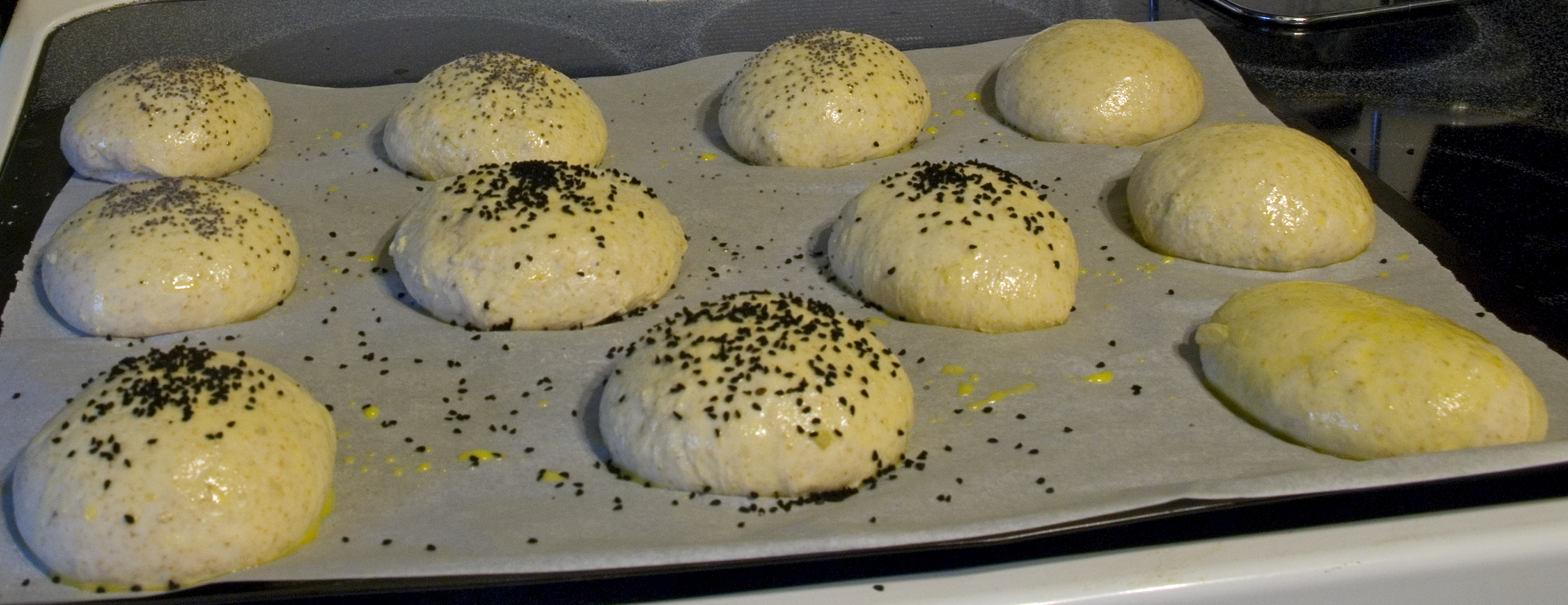 Right before you are ready to put them in the oven, using a simple egg wash brush each roll and sprinkle on your topping of choice. Next add 1 cup of boiling water to your steam pan or follow your own steam procedure.
