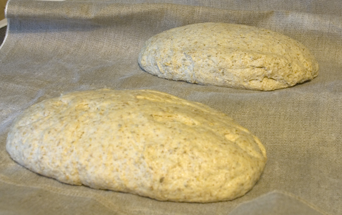 When you are ready to bake remove the bowl from the refrigerator and let it set out at room temperature still covered for 1.5 to 2 hours. Remove the dough and shape as desired. I made 2 loaves free form and placed them onto my bakers linen and covered them up.