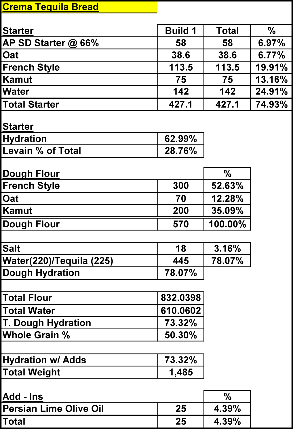 Mix the flours, tequila and most of the water (leave a little to adjust after the autolyse) together in your mixer or by hand until it just starts to come together, maybe about 1 minute.  Let it rest in your work bowl covered for 20-30 minutes.  Next add the salt, starter (cut into about 7-8 pieces), and olive oil and mix on low for a minute.  Add the rest of the water unless the dough is way too wet.   Mix on low-speed for another 4 minutes.  Remove the dough from your bowl and place it in a lightly oiled bowl or work surface and do several stretch and folds.  Let it rest covered for 10-15 minutes and then do another stretch and fold.  Let it rest another 10-15 minutes and do one additional stretch and fold.  After a total of 2 hours place your covered bowl in the refrigerator and let it rest for 12 to 24 hours.