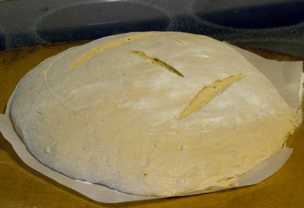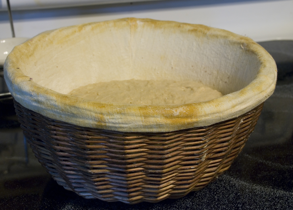 When you are ready to bake remove the bowl from the refrigerator and let it set out at room temperature still covered for 1.5 to 2 hours.  Remove the dough and shape as desired.  I made 1 large miche using a lined wicker basket.  Place your dough into your proofing basket(s) and cover with a moist tea towel or plastic wrap sprayed with cooking spray.