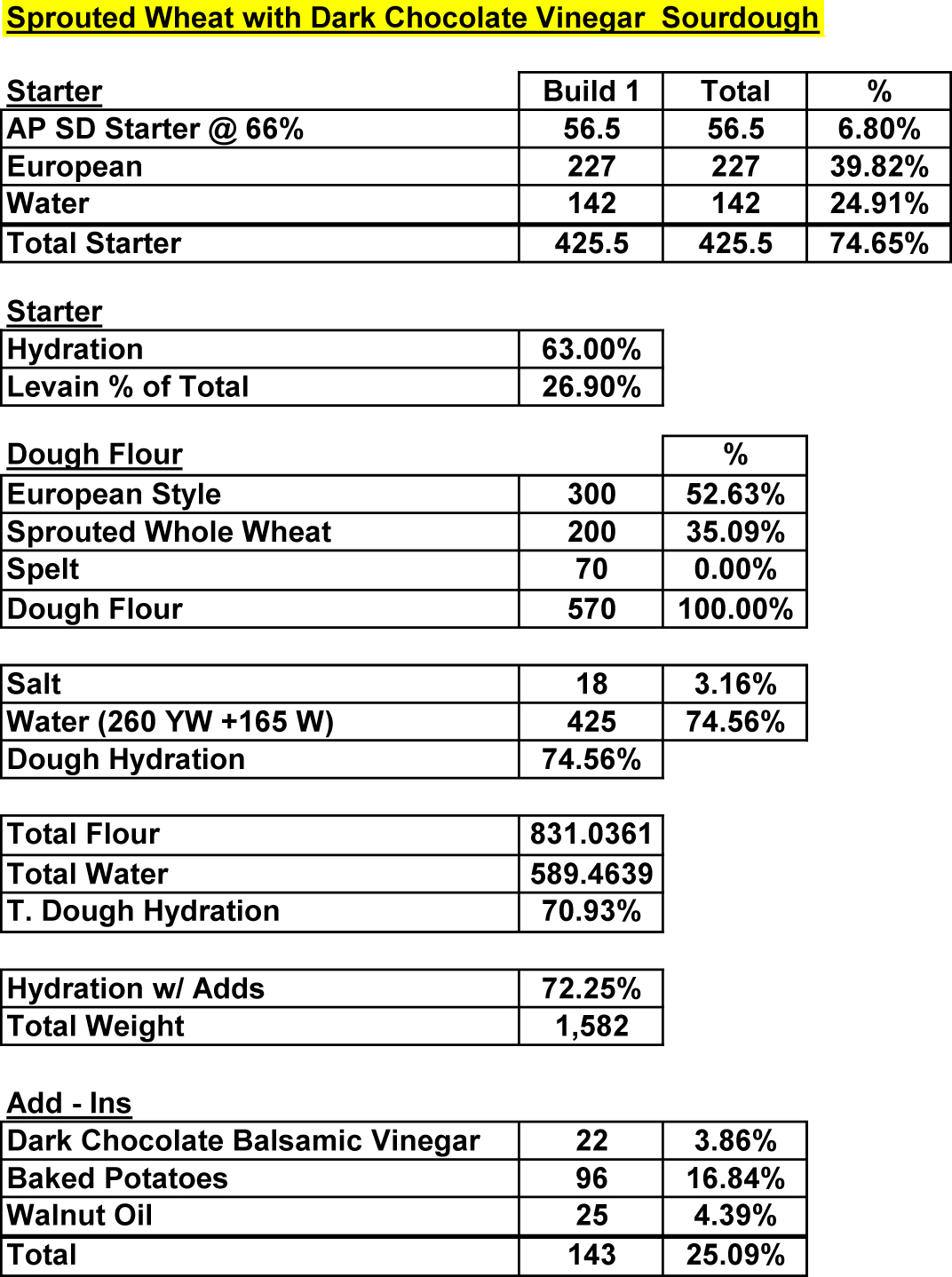 Mix the flours, and 350 grams of the liquids together in your mixer or by hand until it just starts to come together, maybe about 1 minute.  Let it rest in your work bowl covered for 20-30 minutes.  Next add the salt, starter (cut into about 7-8 pieces), balsamic and walnut oil and mix on low for a minute.  Add the rest of the liquid unless the dough is way too wet.   Mix on low-speed for another 5 minutes.  Remove the dough from your bowl and place it in a lightly oiled bowl or work surface and do several stretch and folds.  Let it rest covered for 10-15 minutes and then do another stretch and fold.  Let it rest another 10-15 minutes and do one additional stretch and fold.  After a total of 2 hours place your covered bowl in the refrigerator and let it rest for 12 to 24 hours.