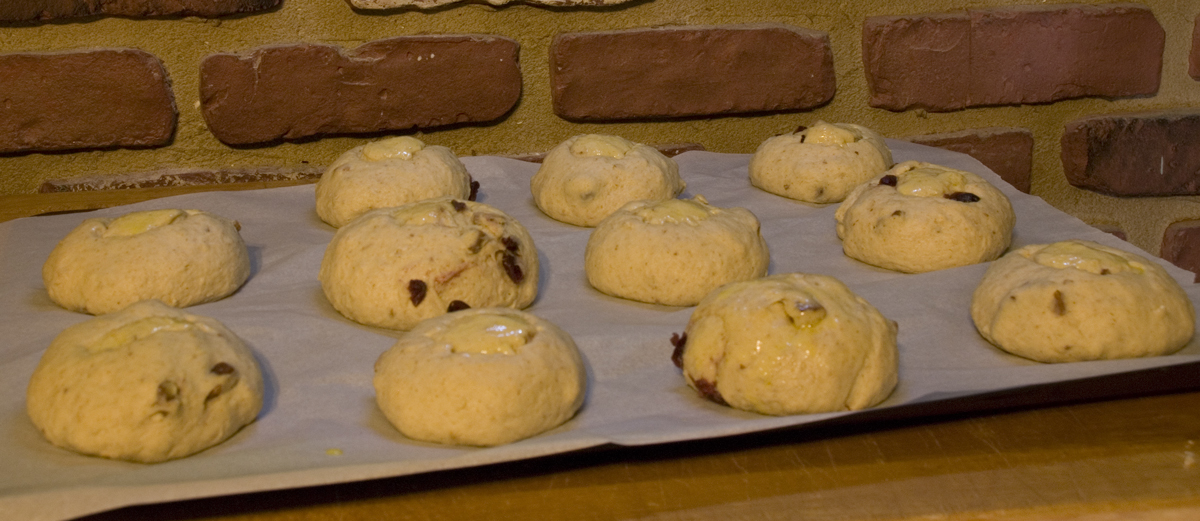 When you are ready to bake remove the bowl from the refrigerator and let it set out at room temperature still covered for 1.5 to 2 hours. Remove the dough and divide into pieces. Shape into rolls and place on a cookie sheet lined with parchment paper and cover with a moist tea towel or plastic wrap sprayed with cooking spray.