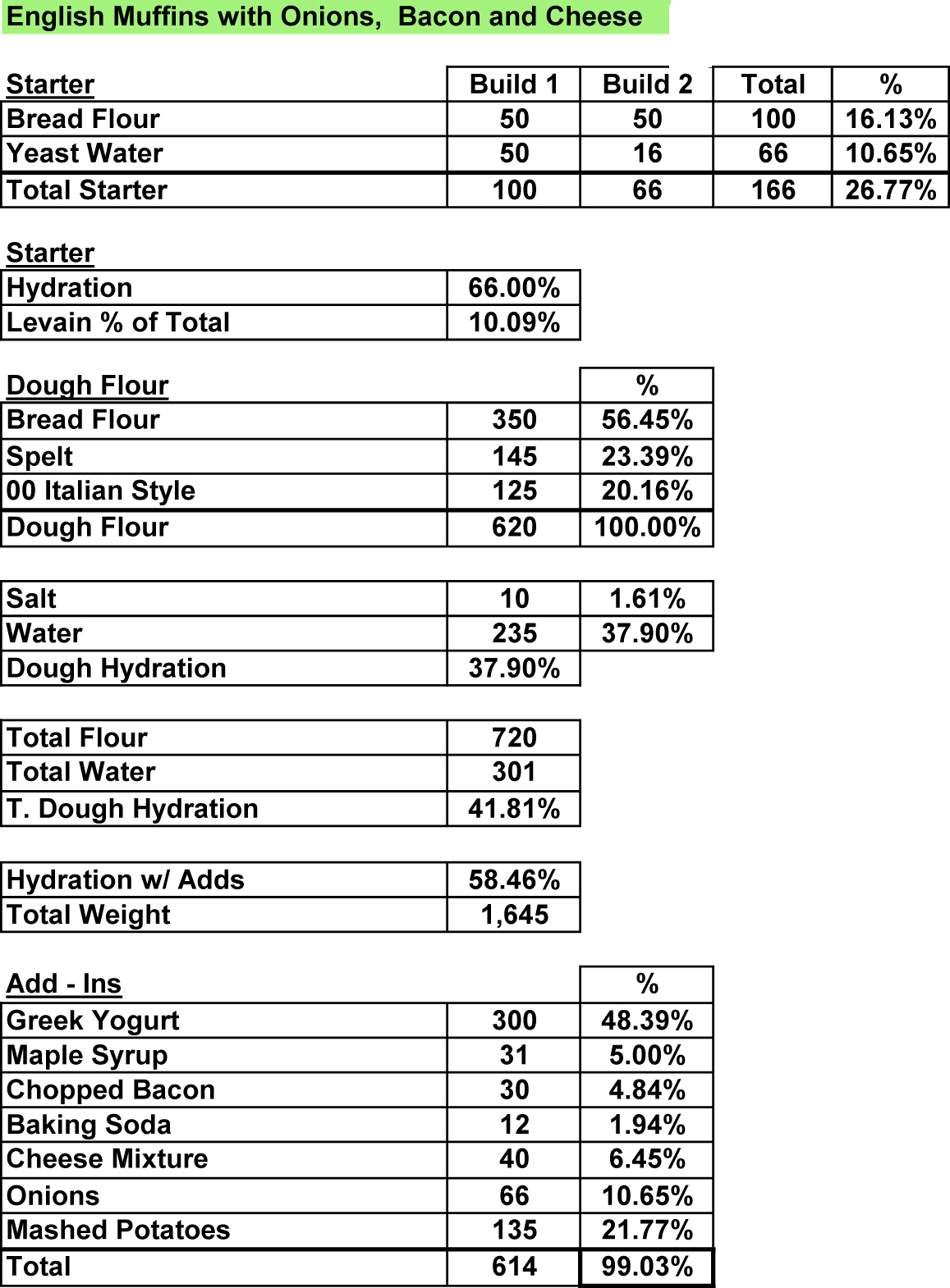 I’ve been craving some bacon lately and I had some left over sautéed onions from our dinner the other night so I figured these would go well in this new formula.  I wanted to see how mashed potatoes would work in this concoction as well.  I’ve been on a maple syrup kick since our trip to Vermont a few weeks ago, so that went in the cauldron in place of the sugar.  Of course some mixed cheese with Parmesan, Asiago and Fontina needed to be added as well as the Greek style yogurt which accounts for around 74% of the additional water in the recipe.