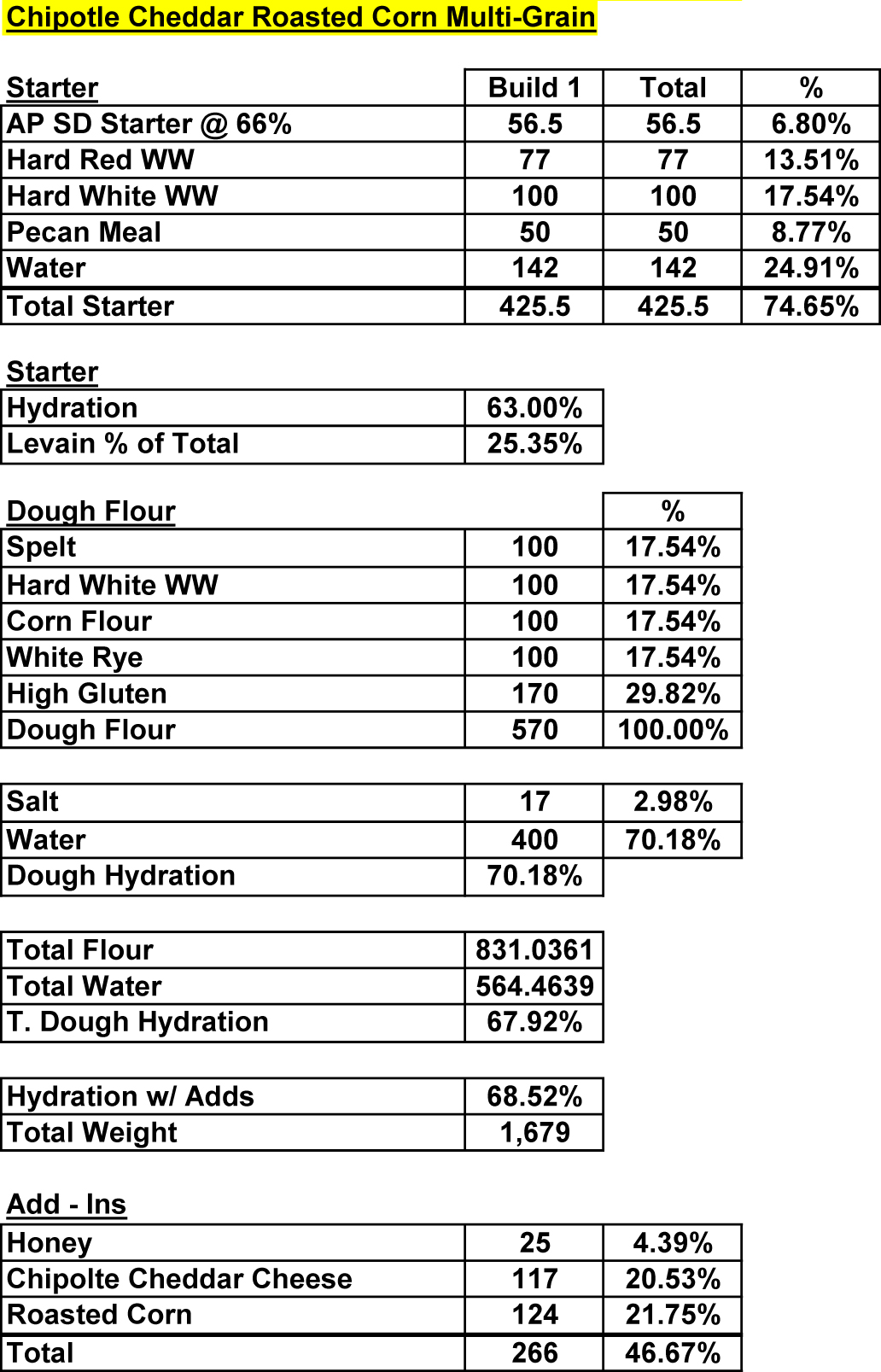Mix the flours, and water together in your mixer or by hand until it just starts to come together, maybe about 1 minute. Let it rest in your work bowl covered for 20-30 minutes. Next add the salt, starter (cut into about 7-8 pieces), and honey and mix on low for 5 minutes. Next add the corn and cheese and mix on low for 1 minute to make sure they are incorporated and then remove the dough from your bowl and place it in a lightly oiled bowl or work surface and do several stretch and folds. Let it rest covered for 10-15 minutes and then do another stretch and fold. Let it rest another 10-15 minutes and do one additional stretch and fold. After a total of 2 hours place your covered bowl in the refrigerator and let it rest for 12 to 24 hours.