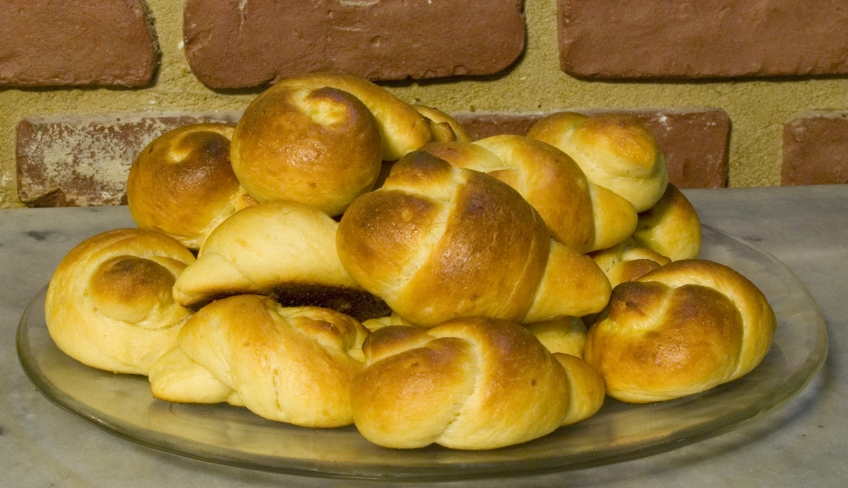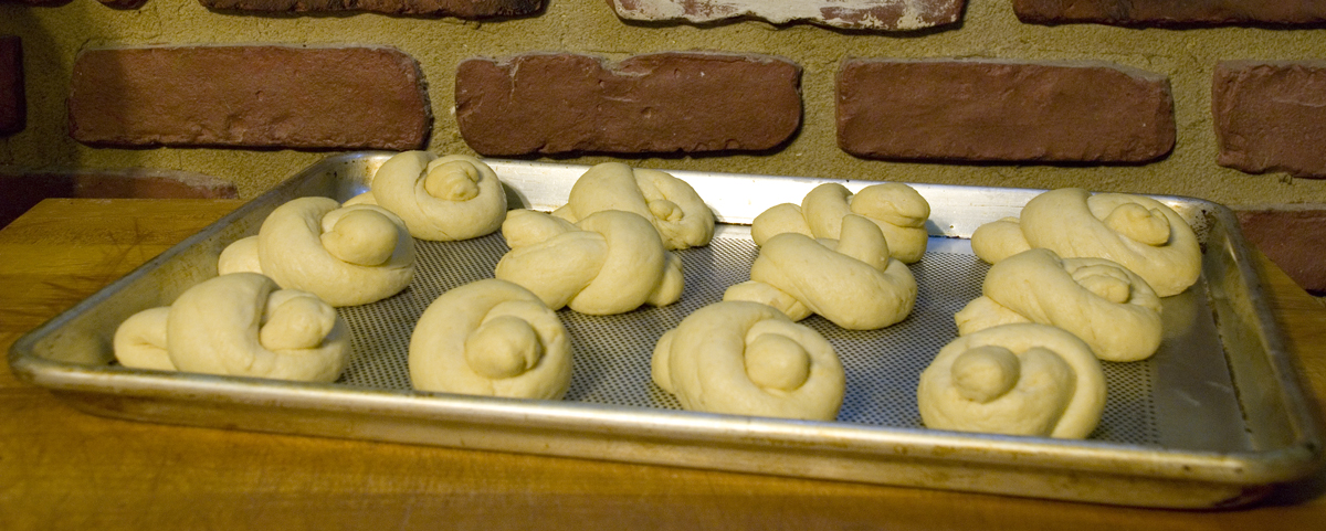 Next gently deflate the dough and form into knots or rolls and place on cookie sheet with parchment paper. Cover with a moist towel or plastic wrap sprayed with cooking spray. Let it sit at room temperature for about 1 hour until the rolls have almost doubled in size and pass the poke test.
