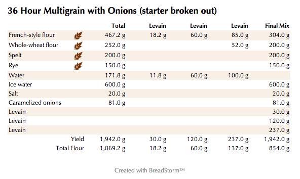 I love caramelized onions and wanted to use them in this bake along with some fresh milled hard winter white whole wheat, spelt and rye along with some KAF French style flour. Other than the different flours this one was pretty straight forward formula and the end results were perfect. The crumb is nice and open and the onion flavor was to die for. I mixed the onions in with the dough when adding the starter and salt and it had plenty of time to permeate the dough.