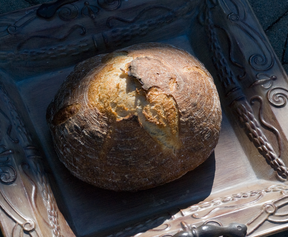 After 5 minute lower the temperature to 450 degrees.  Bake for 35-50 minutes until the crust is nice and brown and the internal temperature of the bread is 205 degrees.