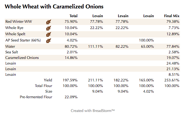 This was supposed to be a high extraction whole wheat loaf but I’m having trouble milling my flour course enough to actually have much bran left to sift out. So, instead I basically used freshly milled whole wheat and added some fresh whole rye flour along with some whole spelt and a whole bunch of caramelized onions.