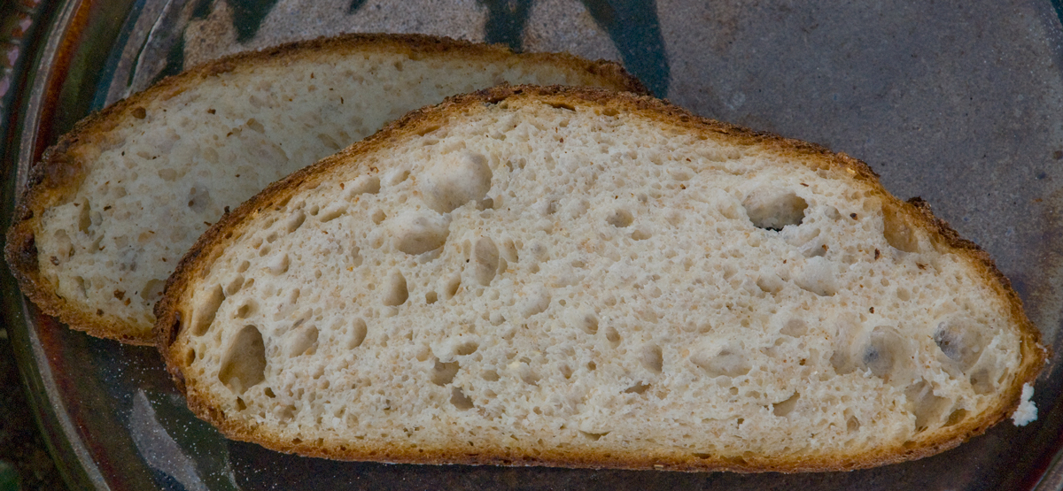 The final bread ended up perfect with a nice dark crisp crust and moist light crumb. The crumb is not too open but is perfect for sandwiches and grilled bread with some fresh mozzarella and tomatoes from my garden.