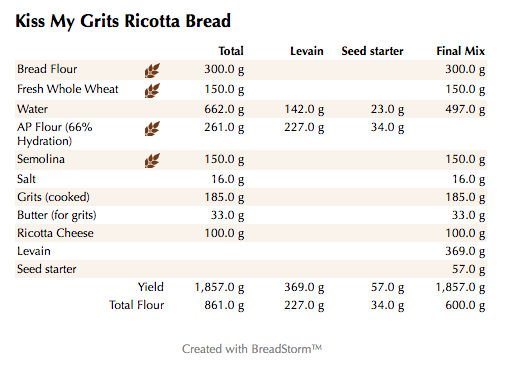 I used my trusty AP starter and added some freshly ground whole wheat flour and some Bob’s Red Mill Semolina along with KAF Bread flour. I did not calculate the water used in the grits into the overall hydration but it definitely affected the final dough which was a little wet but more than manageable after a couple of stretch and folds.
