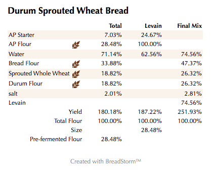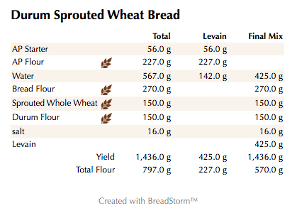The results are in and this one is a keeper. A nice moist and open crumb with the nutty taste of Durum along with the unique flavor of the Sprouted Whole Wheat really makes this one worth baking and eating.
