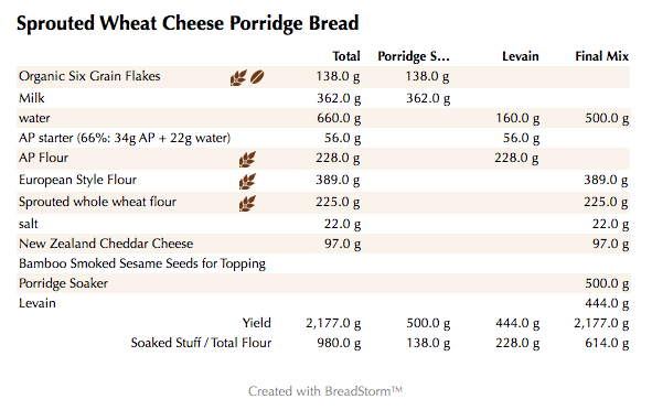 Continuing my exploration of sprouted flour I decided to make a porridge bread using freshly ground and sprouted whole wheat for around 36% of the flour with the balance being KAF European style and AP from the levain.