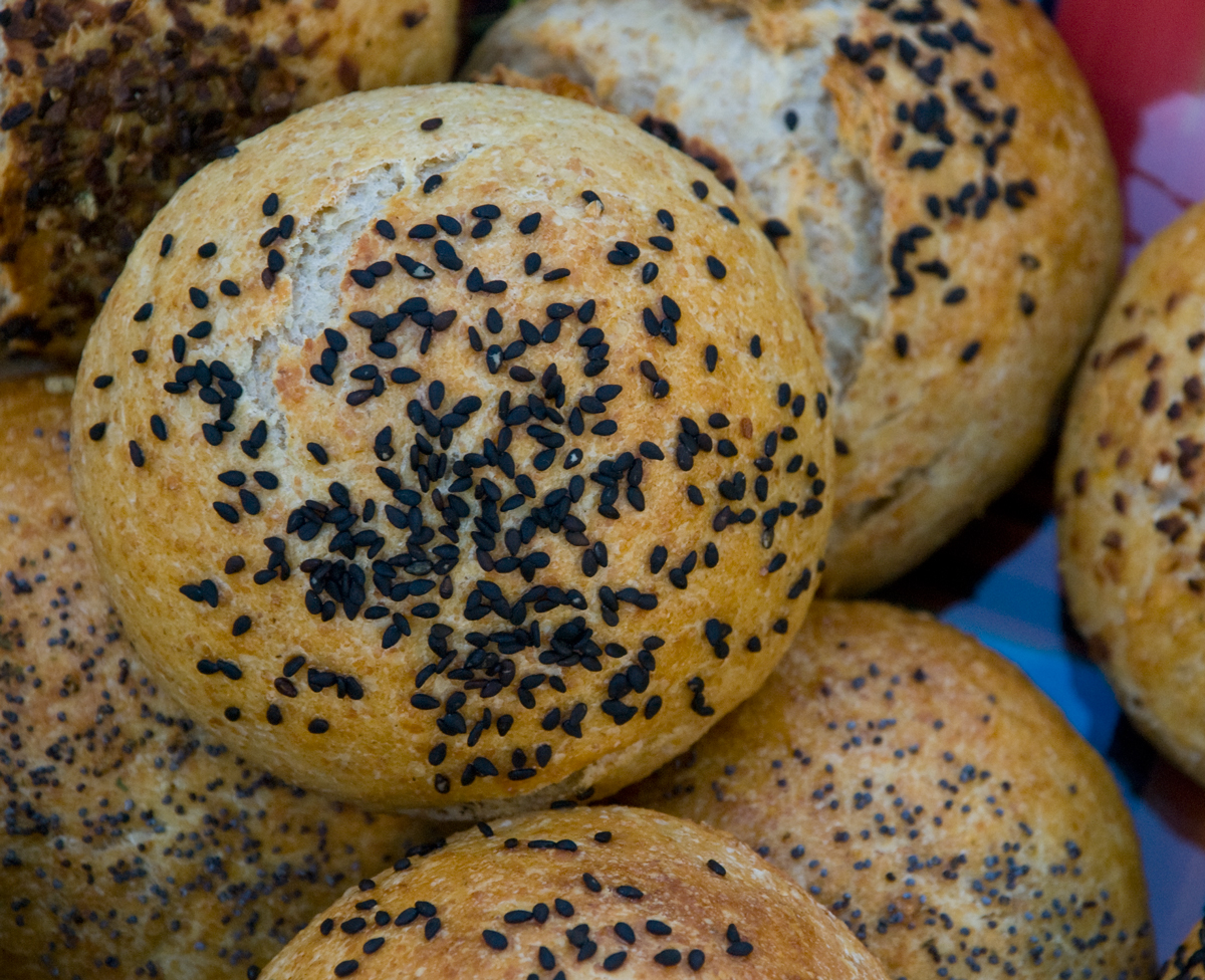 Right before you are ready to put them in the oven, using a simple egg wash or heavy cream or milk, brush each roll and sprinkle on your topping of choice (I used smoked sesame seeds, toasted onions and poppy seeds). Next add 1 cup of boiling water to your steam pan or follow your own steam procedure.
