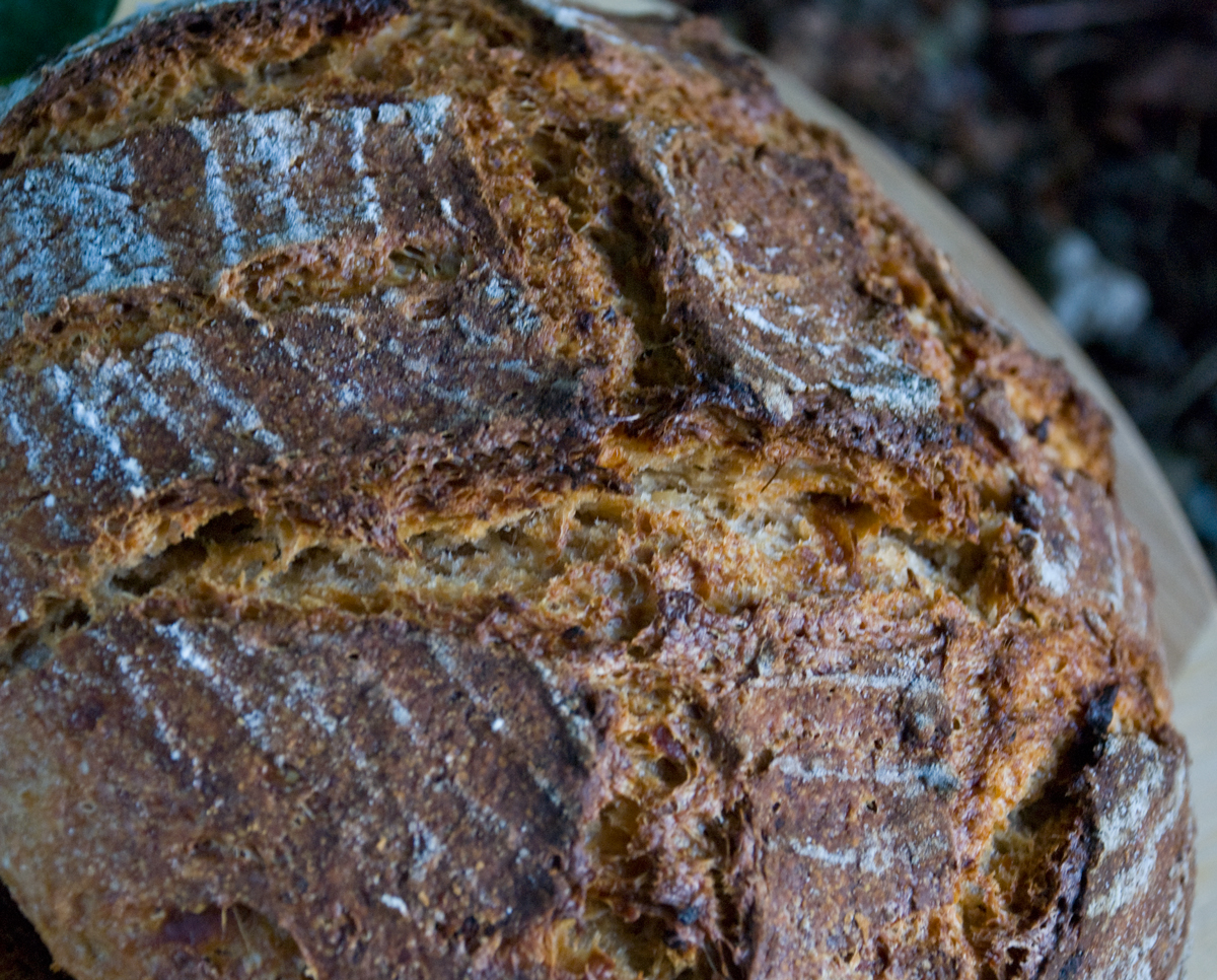 After 5 minute lower the temperature to 450 degrees.  Bake for 35-50 minutes until the crust is nice and brown and the internal temperature of the bread is 205 degrees.