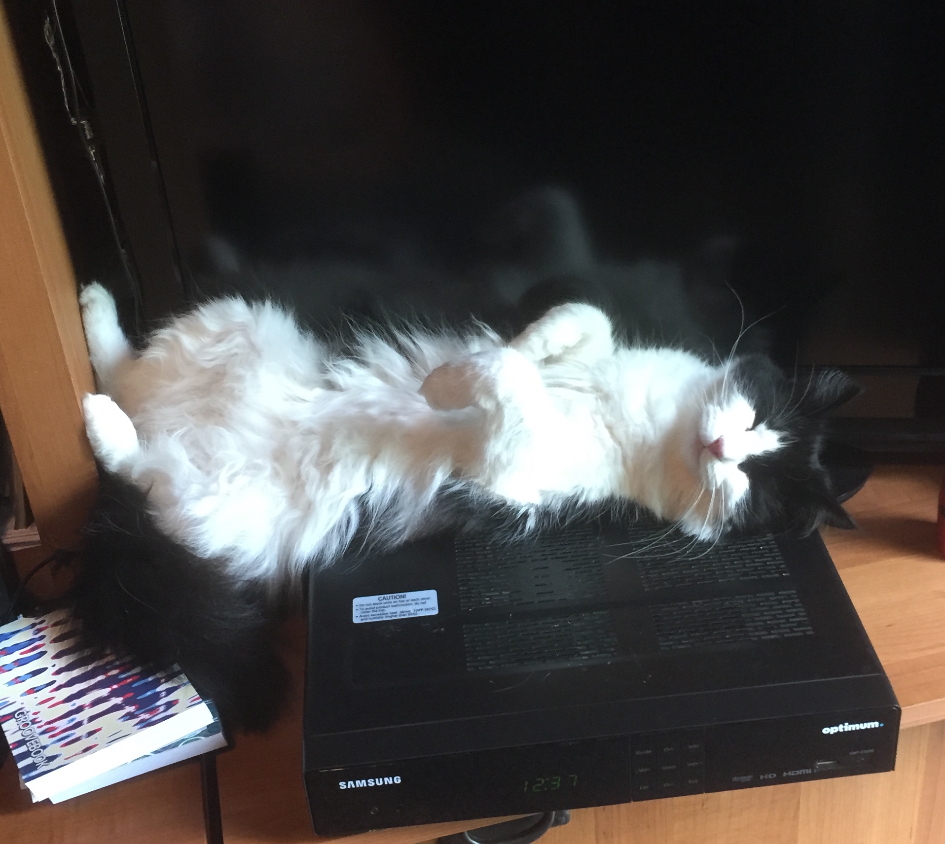 Cosmo–“Panda Bear” catching some sun on the cable box.
