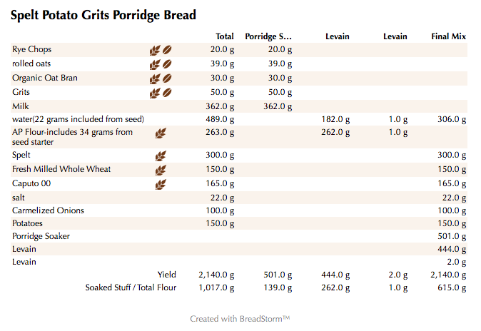 Mix the flours  and the water for about 1 minute.  Let the rough dough sit for about 20 minutes to an hour.  Next add the levain, cooled porridge, potatoes and salt and mix on low for 5 minutes.  Now add the onions and mix on low for another minute until they are incorporated.    You should end up with a cohesive dough that is slightly tacky but very manageable.  Remove the dough from your bowl and place it in a lightly oiled bowl or work surface and do several stretch and folds.  Let it rest covered for 10-15 minutes and then do another stretch and fold.  Let it rest another 10-15 minutes and do one additional stretch and fold.  After a total of 2 hours place your covered bowl in the refrigerator and let it rest for 12 to 24 hours.  (Since I used my proofer I only let the dough sit out for 1.5 hours before refrigerating).