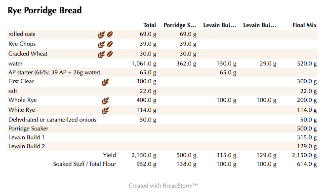 I have to say the taste on this one is fantastic and it’s one of those breads you can eat with nothing on it. The high hydration and porridge component made this breads crumb super moist. I love the onion bits dispersed with the rolled oats, rye chops and cracked wheat.
