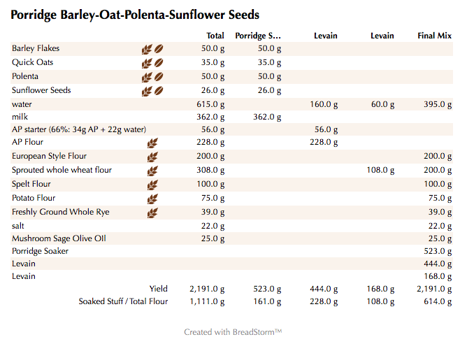 Mix the flours and the water for about 1 minute. Let the rough dough sit for about 20 minutes to an hour. Next add the levain, cooled porridge, and salt and mix on low for 6 minutes. You should end up with a cohesive dough that is slightly tacky but very manageable. Remove the dough from your bowl and place it in a lightly oiled bowl or work surface and do several stretch and folds. Let it rest covered for 10-15 minutes and then do another stretch and fold. Let it rest another 10-15 minutes and do one additional stretch and fold. After a total of 2 hours place your covered bowl in the refrigerator and let it rest for 12 to 24 hours. (Since I used my proofer I only let the dough sit out for 1.5 hours before refrigerating).