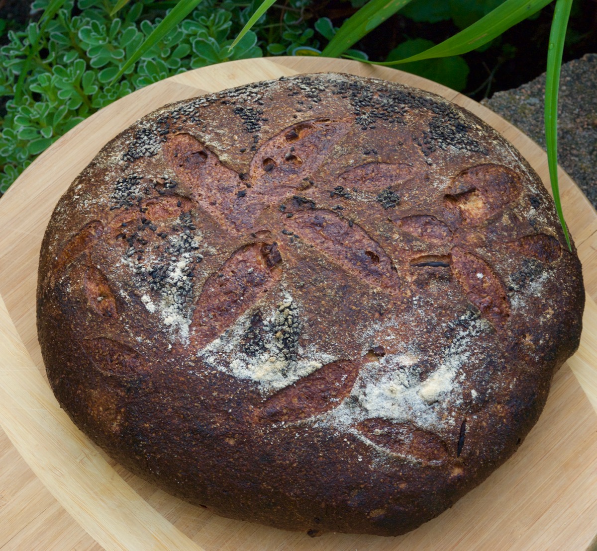 After 5 minute lower the temperature to 450 degrees. Bake for 35-50 minutes until the crust is nice and brown and the internal temperature of the bread is 205 degrees.