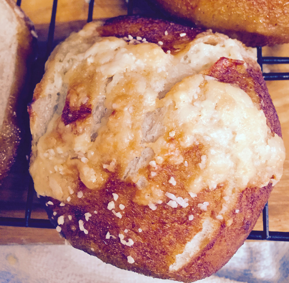 I stuffed each roll with a couple of pieces of extra sharp white cheddar we bought during our last trip to Vermont and sprinkled some on top along with pretzel salt.