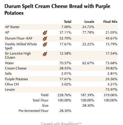 After the nice and hearty apple cider walnut rye bread I baked I needed something a little lighter. This bake with durum, spelt, cream cheese and baby purple potatoes that I roasted the night before was just the ticket. The cream cheese and potatoes really made for a nice soft and moist crumb.